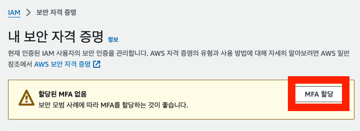 2. 보안 자격 증명 페이지에서 MFA 할당을 클릭한다.