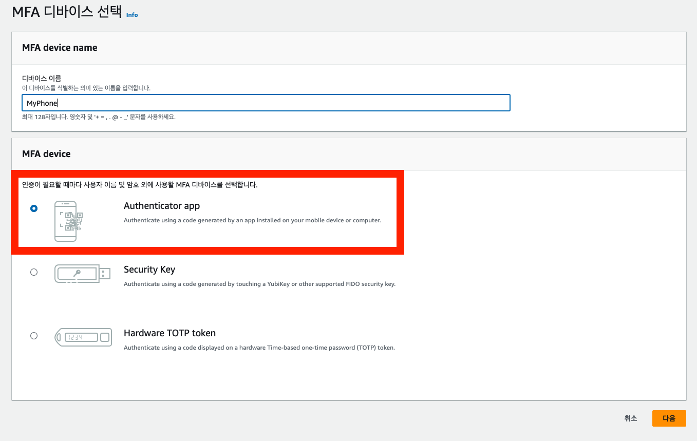 3. 사용할 디바이스 이름을 적고 인증 방법을 선택한다. 본인은 휴대폰에 "Authenticator7"이라는 애플리케이션을 설치하고 인증하는 방법을 선택했다.