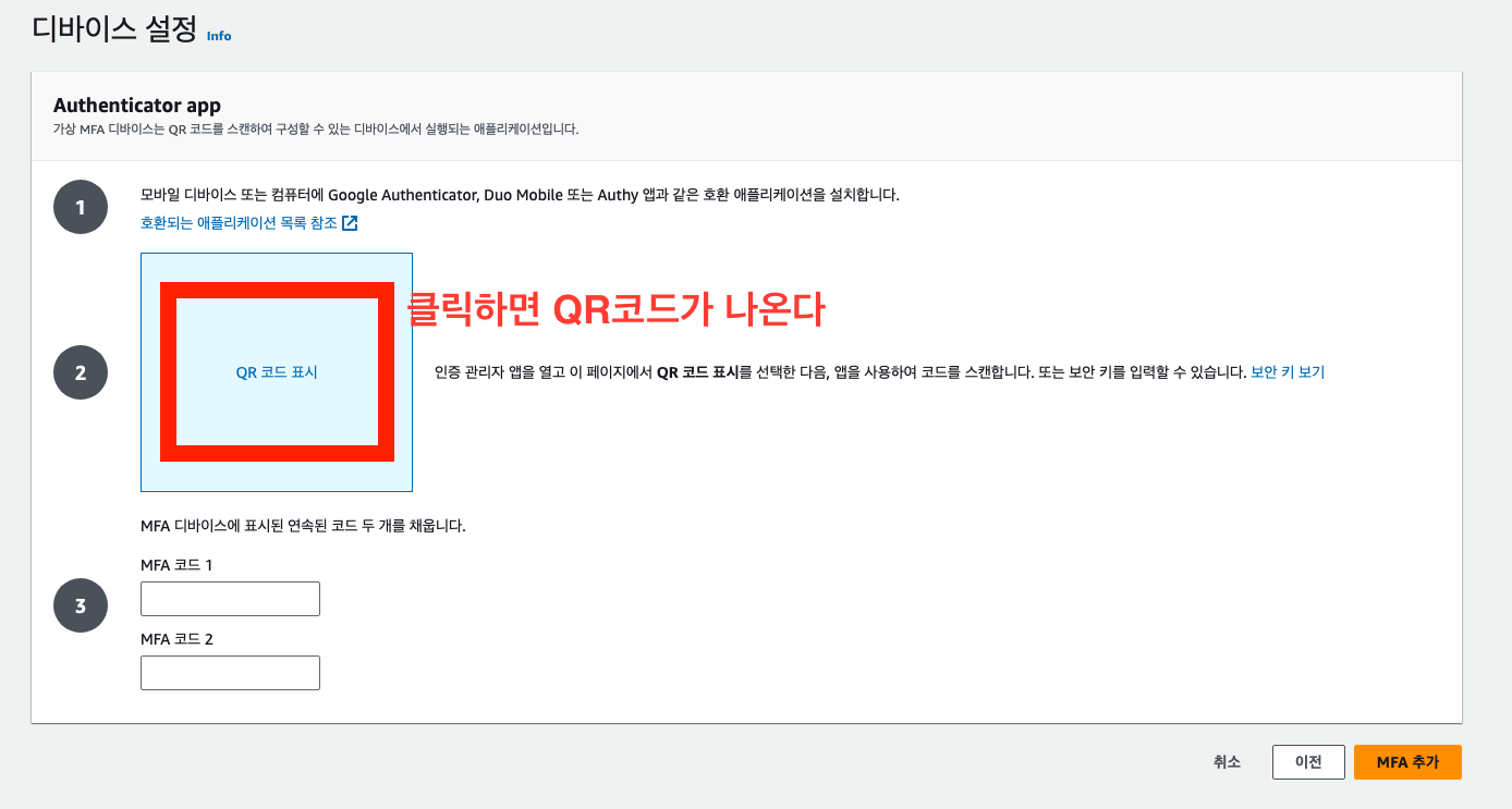 4. 아래 그림과 같이 클릭을 하면 QR코드가 나온다. 설치한 애플리케이션으로 해당 QR코드를 스캔하고 인증코드 차례로 입력하고 MFA추가를 클릭한다.