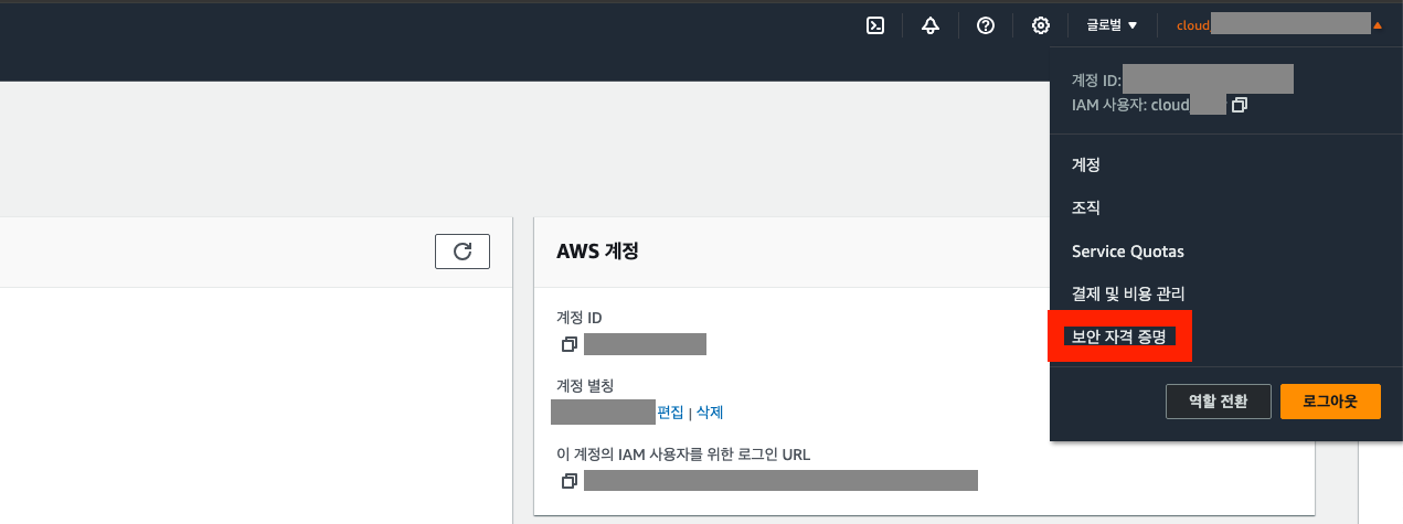 1. 우측 상단 계정을 클릭하면 보안 자격 증명 탭이 나온다.